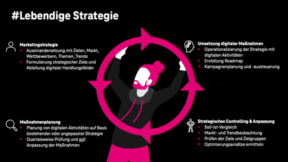 Basierend auf den Erkenntnissen werden strategische Ziele formuliert und digitale Handlungsfelder für das Marketing abgeleitet. Anschließend folgt die Umsetzung digitaler Maßnahmen.