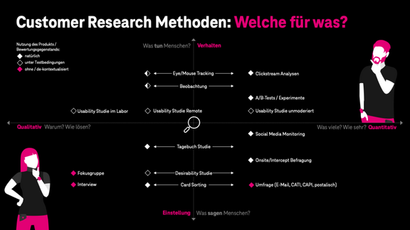 Zum Einsatz kommen dabei verschiedene Methoden wie Befragungen, Interviews, Fokusgruppen oder Usability-Tests. Die nachfolgende Grafik gibt einen Überblick, welche Methode sich für welche Fragestellung besonders gut eignet.