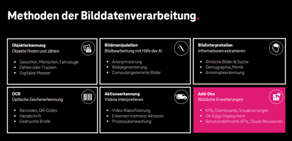 Das maschinelle Sehen lässt sich für verschiedene Use Cases einsetzen. Diese reichen von der einfachen Objekterkennung (inkl. Tracking und Quantifizierung) über Bildmanipulation (Anonymisierung), der Klassifizierung von Objekten (Suche ähnlicher Bilder) und der Zeichenerkennung (Barcodes) bis hin zur Video-Interpretation (Prozessüberwachung/ Anomalie-Erkennung).