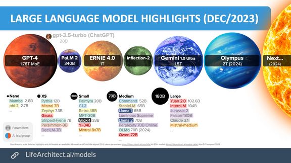 Unternehmen wie Alphabet (mit Bard und Gemini vom Google), Amazon (mit Alexa und Olympus) und Microsoft (mit GPT, Q* von OpenAI) sind ganz vorne mit dabei und investieren massiv in die Entwicklung von KI-Modellen. Doch das sind längst nicht die Einzigen. Unter den „glorreichen Sieben“ der führenden US-amerikanischen Tech-Unternehmen ziehen auch Meta mit ihrem Open-Source-Ansatz (Llama) sowie Apple nach. NVIDIA als weltweit führender Anbieter für KI-Computing liefert die inzwischen heißbegehrte und unverzichtbare Hardware. Diese Unternehmen haben einen erheblichen Vorsprung, der schwer einzuholen ist. Die Sprachmodelle sind unfassbar riesig in ihrer Größe und werden auch in verschiedenen Ausführungen und Anwendungen bereitgestellt. Aber auch der chinesische Markt darf nicht aus den Augen verloren werden, mit ERNIE hat Baidu bereits ihren KI-Chatbot in Suche, Kartendienst, Cloud- und Business-Apps integriert.