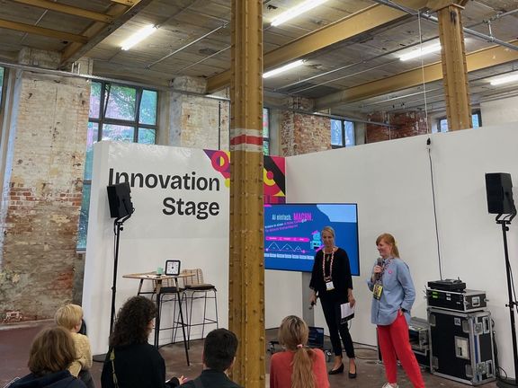 Es ist trubelig in der Halle 14 auf dem ehemaligen Baumwollspinnerei Gelände in Leipzig, in dem wir unseren Stand aufgebaut haben. Nach einem Tag gefüllt mit Gesprächen über Innovation, Digitalisierung und natürlich KI, begeben sich Katrin Fischer (Principal Consultant Digital Innovation) und Caroline Mehner (Senior Information Technology Consultant E-Commerce) zielstrebig und bewaffnet mit Handouts und Stiften in Richtung der Bühne, auf der die beiden Expertinnen sich voll und ganz dem Thema KI und Innovation widmen wollen.