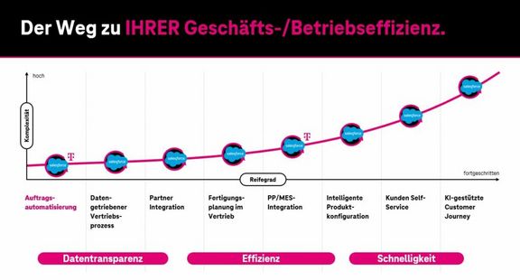 Unser Reifegradmodell zeigt den Entwicklungsprozess, den Unternehmen durchlaufen, um Produktion und Vertrieb zu verbinden und so die Geschäfts- und Betriebsprozesse effizienter zu machen: