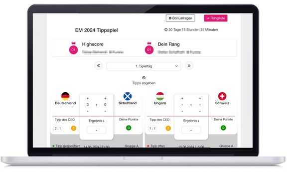 Um ein Tippspiel zur EM im Unternehmen einzuführen, gibt es ein spezielles Plugin, das von Telekom MMS und Tippevent.de, einem Unternehmen aus Dresden, entwickelt wurde. Dieses lässt sich nahtlos in das Intranet oder die Mitarbeitenden-App integrieren, ohne zusätzliches Login. Wer bereits mit Staffbase oder Haiilo arbeitet, kann auf das Plugin schnell und unkompliziert zugreifen. Ansonsten ist eine Einrichtung innerhalb einer Woche möglich.