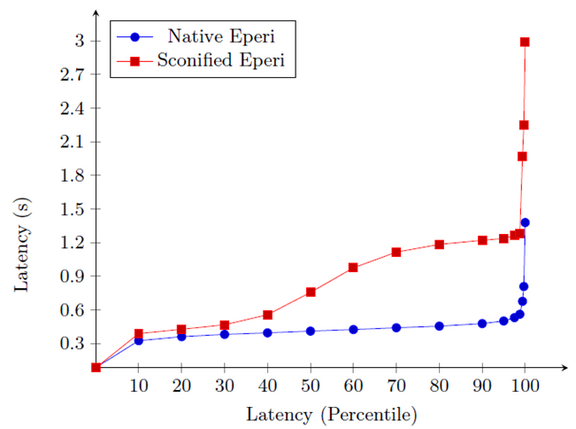 The graph depicts the percentile distribution of latency for HTTP queries from clients to Microsoft Outlook via eperi Gateway native and sconified implementations.We may disregard the final spike in the graph as the result of stragglers. In the sconified version, about one-third of requests are provided within 450 milliseconds and 90% within 1.2 seconds, whereas 90% of HTTP requests are handled within 500 milliseconds in the native deployment of eperi Gateway.
