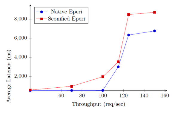 The graph indicates that both systems function similarly until 100 requests per second, at which time the latency of the Sconified deployment substantially increases. The native eperi deployment outperforms, hitting 110 requests per second.