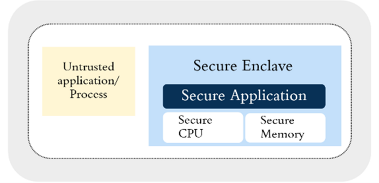 Enclaves are secure and trusted segregated memory areas in which the code running is isolated from other untrusted programs, including privileged code. Enclave code and data are stored in a secured physical memory section known as the enclave page cache (EPC). When data on EPC pages is migrated to DRAM, it is protected at the granularity of cache lines. In its initial iteration, SGX used to support EPC of up to 128 MB, but now 3rd Generation Intel® Xeon® Scalable Processors support 512 GB of EPC size, which adds up to 1 TB on a two-socket platform.