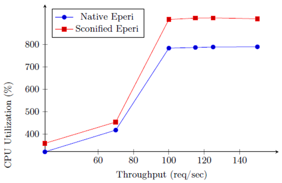Under maximum throughput, both the native and Sconified deployments achieve a maximum CPU usage of 790% and 910%, respectively.