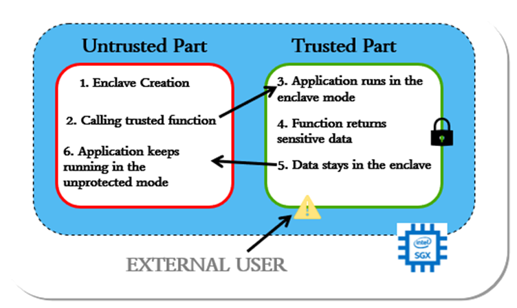 In addition to being integrity secured, enclave memory also detects memory changes and rollbacks. Additionally, Intel SGX offers a function for remote attestation, which is one of the core principles in trusted computing This makes it possible for a challenger to confirm the TEE’s reliability and remotely attest software and code running inside an enclave without gaining access to it in clear text. Please check the images below to understand better about SGX.