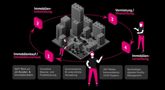 Virtuell besichtigen, planen und vermarkten: mit innovativen VR & XR-Lösungen können Interessenten virtuelle Immobilien besichtigen und ihre Wunscheinrichtung bereits vorab visualisieren. Zudem ist es über XR-Optionen möglich, zusätzliche Informationen zum Objekt zu erhalten. Dieses immersive und mobile Erleben von Mietobjekten revolutioniert die Immobilienvermarktung. Durch individuell angepasste, digitale Erlebnisse werden Interessenten begeistert und die Abschlussquote kann dadurch gesteigert werden. Zudem können VR-Lösungen den Akquise-Prozess effizienter gestalten: der Makler kann virtuell hinzugezogen werden, ein KI-Concierge kann erste Beratungsgespräche ergänzen, Vor-Ort-Termine lassen sich reduzieren.